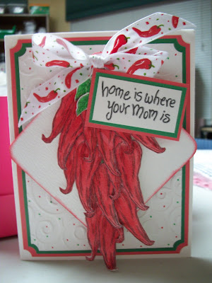 Cammie made this one. Carolyn King is her name, and she really started this whole thing. She has a blog and does an annual card drive for Alzheimer's care givers. She was featured in two paper craft magazines this year! She does the card drive because her grandmother had Alzheimer's and really appreciates what the care givers have to do. She gave an address of a facility in Pennsylvania where people could send cards and suggested that you send cards to other care givers as well. Cindy posted the address where I take my mom for respite care, but I didn't expect all the tea partiers to send ME cards too!!!